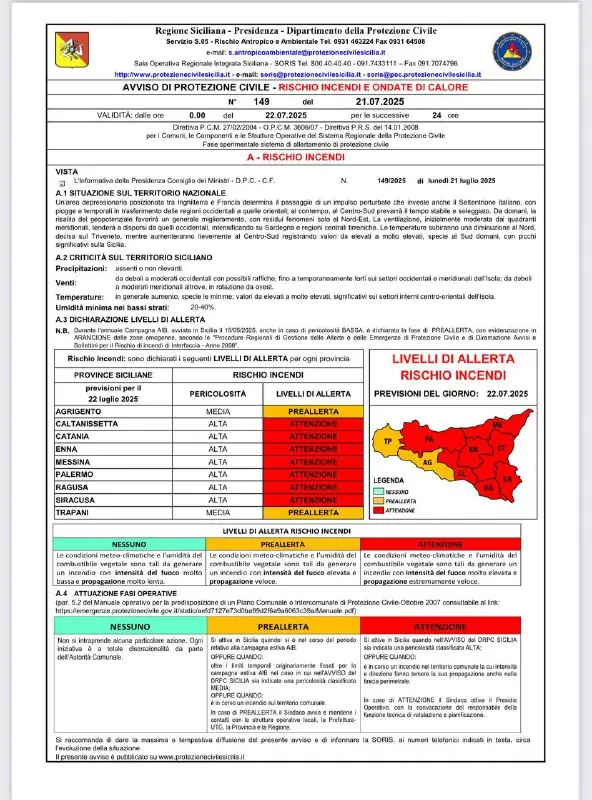 Comunicato protezione civile regionale.Avviso di protezione civile per rischio incendi e ondate di calore.Domani‚ giovedì 26 luglio 2025‚ è prevista una pericolosità MEDIA per rischio incendi in tutta la Sicilia. Bollino rosso per rischio Ondate di Calore a Messina e Catania.